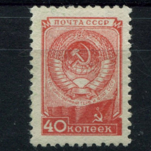 Стандартный выпуск 1948 года. Герб и флаг СССР. Размер рисунка 14,3 х 21,3 мм ( 1233 II )