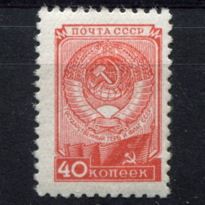 Стандартный выпуск 1948 года. Герб и флаг СССР. Размер рисунка 14,3 х 21,3 мм ( 1233 II )